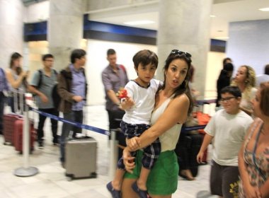 A cantora Ivete Sangalo viajou com o filho, Marcelo, de três anos, neste domingo (12). Depois de se apresentar no Rio com a turnê “Real Fantasia”, a cantora foi fotografada com o filho no colo no aeroporto Santos Dumont, na Zona Sul da cidade, embarcando de volta para Salvador, na Bahia. Xuxa, Carolina Dieckmann e Bruna Marquezine estavam entre as inúmeras famosas que prestigiaram o show da artista no Rio, que aconteceu neste sábado, 11. Durante a apresentação, a cantora baiana chamou as três para subirem ao palco. "Xuxa, eles querem que você cante... Venha, venha", brincou com a apresentadora. "Eu não canto, não canto, Veta. Para com isso!", respondeu a Rainha dos Baixinhos. Com a insistência, as duas cantaram a música infantil "Todo Mundo Tá Feliz" - um clássico na carreira da apresentadora - enquanto Marquezine dançava empolgadíssima na lateral do palco.